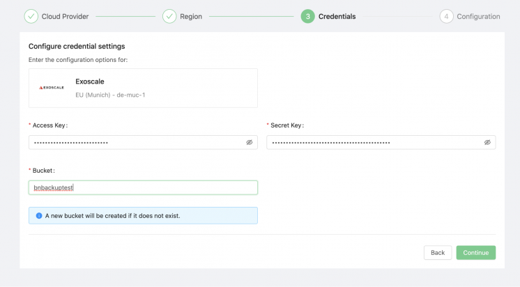 3. Enter the ZelusIT credentials. It is good practice to create a new dedicated bucket and IAM key for that purpose, ideally restricted to the specific bucket and only to the needed operations. You can then indicate the bucket name in the Backup Ninja wizard.
